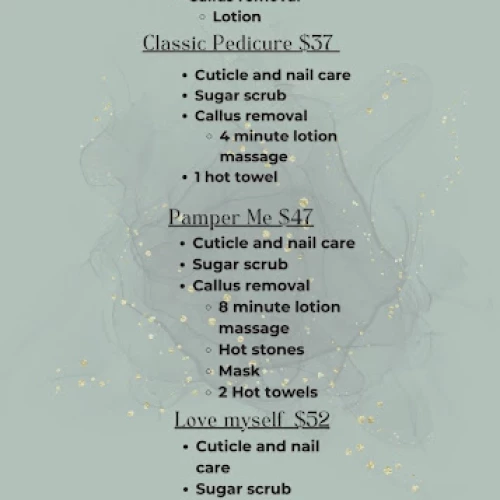 | Spa Pedicure | Foot soak, exfoliation, massage, cuticle care, polish | $36 |